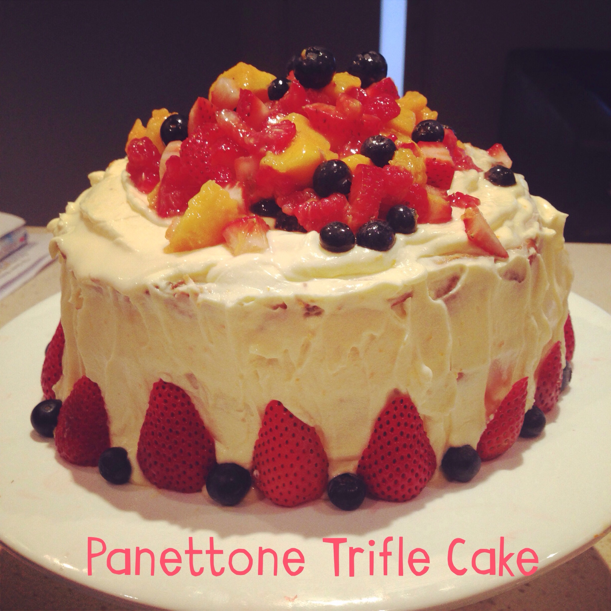 This is based on an old family cake recipe, replacing the sponge cake with a panettone (Italian Christmas bread). Thick slices of this citrus-flavoured bread are brushed with orange syrup and layered with cream and raspberries (or strawberries, if desired), giving you an almost instant “trifle” cake.